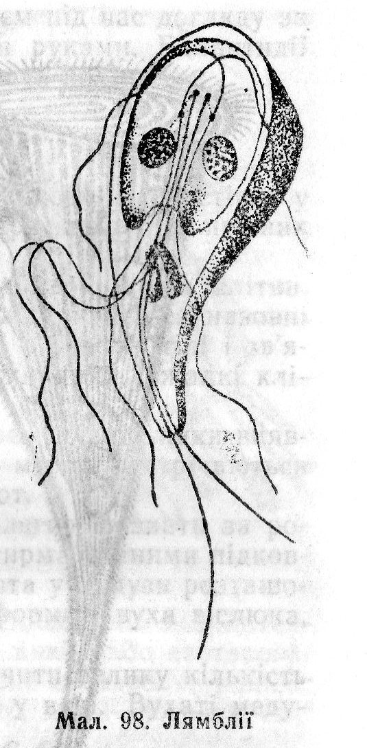У морях живе джгутиконосець ночосвітка, який викликає дивовижне світіння моря. Воно виникає за рахунок окислення жирів, посилюється під час руху води, наприклад, коли набігає на берег хвиля. Враження від цього незвичайного явища западає дітям глибоко в пам'ять. До паразитичних джгутикових належать лямблії (мал. 98). Цього паразита відкрив у 1859р. професор Харківського університету Лямбль. Хвороба, що викликається цим збудником, називається лямбліозом. Лямблії живуть у тонкій кишці, зокрема у дванадцятипалій кишці, у протоках печінки, жовчному міхурі. Живляться паразити осмотичне. Лямблії порушують функцію печінки, нервової системи, а також органів травлення. Вони можуть спричинити лямбліозний холецистит, гепатит і нерідко жовтяницю. Лямбліоз виникає там, де порушуються норми особистої гігієни. Хворий на лямбліоз виділяє з екскрементами цисти. Людина заражається при проковтуванні цист із забрудненими продуктами, водою. Клас Споровики об'єднує внутрішньоклітинних паразитів багатьох тварин і людей, що спричиняють тяжкі захворювання: малярію у людей, кокцидіоз у тварин і людей, піраплазмоз у великої і дрібної рогатої худоби тощо. На одній із стадій свого розвитку вони розмножуються спорами, від цього і назва — споровики. Живляться вони всією поверхнею тіла. До споровиків належать різні види малярійного плазмодія — збудника малярії людини і тварин. Переносник збудника малярії людини є самиця малярійного комара анофелеса. Малярійний плазмодій проходить складний цикл розвитку. Кокцидія викликає тяжке захворювання — кокцидіоз. Воно вражає молодняк багатьох свійських тварин, особливо кролів, велику рогату худобу, курей, риб. До класу Інфузорій належать найбільші за розмірами найпростіші. Тіло їх вкрите оболонкою і війками. Розмножуються інфузорії поділом і статевим шляхом — кон'югацією. Інфузоріями називали всі мікроорганізми, численне населення яких було виявлено у настоях із сіна, листя та інших рослинних решток у часи А.Левенгука. Інфузорія туфелька — звичайний мешканець боліт, рівчаків. Вона добре розмножується у настої сіна і їжею її є сінні бактерії. В свою чергу інфузорій споживають рачки, личинки риб тощо. Без цих «нікчемних», як їх називав Левенгук, істот, існування багатьох водних тварин було б неможливий.