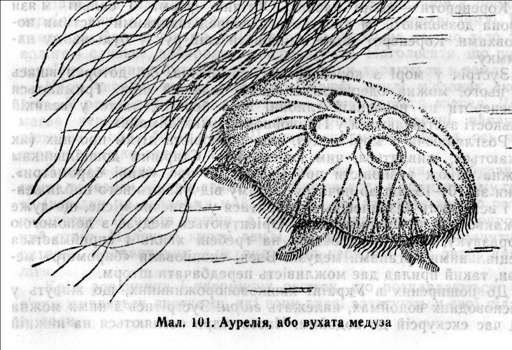 Аурелію, або вухату медузу (мал. 101), легко впізнати за рожевим або злегка фіолетовим кольором і чотирма темними підковками у середній частині дзвона. По краях рота у медузи розташовані довгі ротові лопаті, що нагадують за формою вуха віслюка, за що медузи і одержали таку назву. Влітку в тиху спокійну погоду можна бачити велику кількість цих гарних медуз, які повільно колишуться у воді. Вухаті медузи — погані плавці. Через скорочення дзвона вони можуть повільно підійматися до поверхні і опускатися в глибину. Живиться аурелія планктоном (рачками, плаваючою ікрою риб), який підганяє до рота за допомогою щупалець, усаджених значною кількістю жалких клітин. У людини аурелія значних опіків не викликає. Розмножуються вухаті медузи, виділяючи яйцеклітини і сперматозоони, які проходять складний розвиток. «Кришталеве м'ясо» аурелій може використовуватися в їжу.