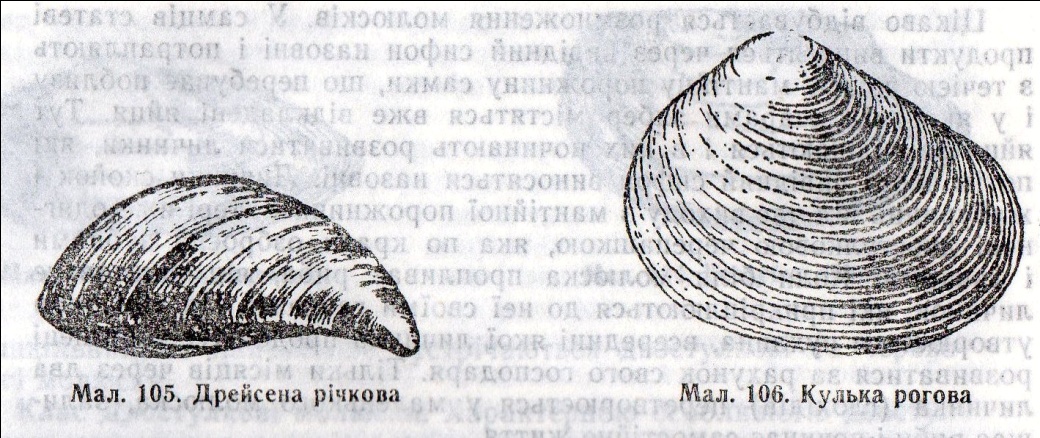 Досить звичайним молюском наших прісних водойм є дрейсени (мал. 105). Вона невеликих розмірів, до 3,5—4 см завдовжки, з дуже характерним тригранним обрисом черепашки, за що її називають тригранною. На відміну від інших наших молюсків, дорослі дрейсени ведуть прикріплений спосіб життя. Вони виділяють речовину, що перетворюється у воді в міцні нитки, так звані бісуси, якими дрейсени прикріплюються до підводних предметів: каміння, свай, різних водних рослин. Особливо сильно розвинулися поселення дрейсени на великих водосховищах Дніпра, де ними обростають залишки затоплених дерев, кущів, а також гідротехнічні споруди, труби, захисні грати. Все це утруднює приток води і потребує постійної чистки. Інакше відбувається у дрейсени і розвиток потомства: з яєць виходять на волю дрібненькі вільно-плаваючі личинки, що пересуваються за допомогою війок і прикріплюються до субстрату. Показуючи дітям дрейсен і розповідаючи про їхнє життя у воді, слід сказати про їх значення. Дрейсени, як і інші двостулкові молюски, є фільтра торами водойм, їх личинки є кормом для деяких риб. Шкодять вони лише гідротехнічним спорудам. Звичайними мешканцями наших прісноводних водойм є кульки і горошинки. Кульки (мал. 106) — це дрібні двостулкові молюски з округлою черепашкою 2,5 см завдовжки. їхній спосіб живлення подібний до скойок. Розмножуються вони живо-народженням. Яйця розвиваються у них в особливих виводкових камерах, які утворюються на внутрішніх зябрах, так що з материнської черепашки виходять уже готові молоді кульки. Кількість їх не перевищує десятки.. Найбільш дрібні молюски горошинки населяють наші прісні стоячі і проточні водойми. Як і інші молюски — вони фільтрат ори. Враховуючи користь молюсків — фільтра торів для природи і людини, а також скорочення їх чисельності через забруднення води у водоймах гербіцидами, пестицидами тощо, потрібно сформувати бережне ставлення до них у дошкільників. Прісноводні молюски зимують на дні водойм, зариваючись у мул.