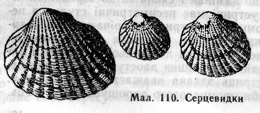Серцевидки, або кардіями (мал. 110),— поширені молюски з характерною серцеподібною черепашкою. У них добре розвинута клиноподібна «нога», за допомогою якої вони не тільки пересуваються і швидко закопуються в грунт, але й підстрибують на кілька сантиметрів над дном, коли відчувають небезпеку. Серцевидки, як і інші види двостулкових молюсків — фільтра тори. їх личинки поїдають риби. Із спресованих черепашок серцевидок, які нагромаджувалися на дні моря протягом значного часу, утворився чудовий будівельний матеріал — черепашник, який видобувають у катакомбах поблизу Одеси та в інших місцях. Клас Черевоногі молюски. Для представників цього класу молюсків характерна наявність на голові двох щупалців і великої «ноги», що являє собою виріст черевної частини тіла і пристосована до пересування. Одна з особливостей будови черевоногих молюсків — їх черепашка, що схожа на пірамідку з широкою основою і гострою верхівкою. До черепашки прикріплюється тіло молюска. Серед черевоногих молюсків є такі, що дихають легенями і зябрами.