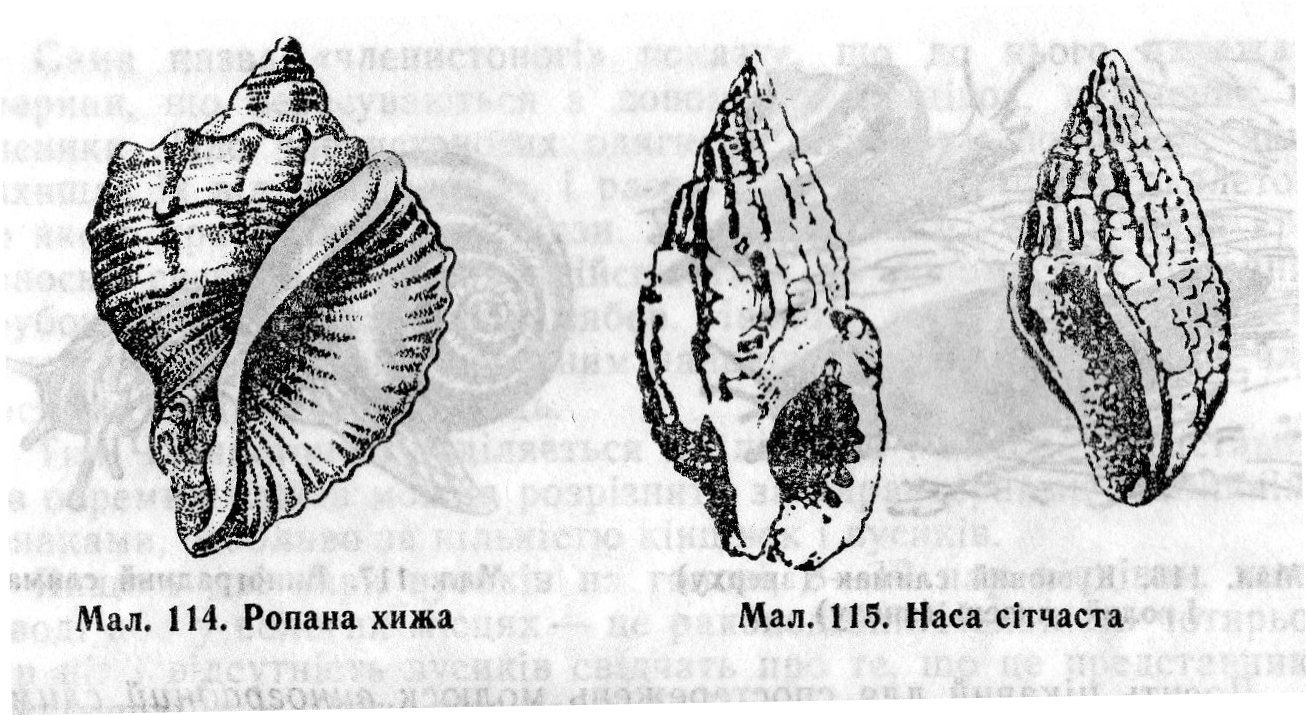 З морських форм черевоногих молюсків, поширених в Україні, увагу дошкільників приверне велика ропана хижа (мал. 114). У сорокових роках нашого століття личинки ропани були занесені на днищах кораблів у Чорне море і надзвичайно поширилися тут. Ропана — хижак. Вона знищує устриць. Маленька наса сітчаста (мал. 115) — досить звичайний молюск Чорного і Азовського морів. Розміром невеликий — близько 20—30 мм, має гарну черепашку світло-жовтого забарвлення зі смужками голубувато-чорного і коричневого кольорів. Уся поверхня черепашки прикрашена злегка звивистими ребрами, які пересікаються глибокими спіральними боріздками, інколи досить яскраво забарвленими.