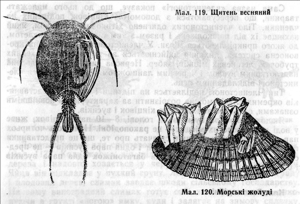У мілких пересихаючих водоймах, у лісових калюжах інколи з'являються щитні (мал. 119) — «живі викопні» ракоподібні наших водойм. Свою назву вони одержали тому, що їх голово груди зверху вкриті хітиновим щитом. Тонке членисте черевце виступає з-під щита. Відкладені щитнями яйця здатні переносити і пересихання водойм і зимове промерзання ґрунту. З'являються щитні насамперед у дощові роки. У приморській місцевості великий інтерес у дітей викликають вусоногі рачки — морські жолуді (мал. 120). Вихователь може показати їх на черепашках устриць, мідій, на камінні морських скель. Розповідаючи про них, слід звернути увагу, що тіло цих рачків прикрите черепашкою, що складається з кількох вапнякових пластинок з гострими краями. Сидячи у черепашці, рачок виставляє свої ніжки, якими підганяє до рота різні органічні частинки. Ними він живиться. З цікавістю діти вислухають розповідь про те, що морські жолуді — мореплавці. Вони оселяються на днищах кораблів і здійснюють далекі мандрівки. Проте такі мандрівники небажані для пароплавів, бо знижують їх швидкість і доводиться витрачати більше пального. Яйцями і личинками морських жолудів живляться різні риби. До вищих ракоподібних належать річкові раки, раки-самітники, креветки, краби, а також стоноги звичайні, водяні ослики. Річкові раки зустрічаються в річках і озерах з мулистим дном і урвистими берегами. Тут під камінням, під корчами раки клешнями виривають нірки і вдень ховаються в них. З темнотою вони стають більш рухливими і виходять добувати собі корм. Роздивляючись з дітьми річкового рака, слід звернути увагу на те, що тіло його вкрите панциром, який має захисне бруднувато-буре забарвлення. У пошуках їжі рак повільно повзає по дну, рухаючи своїми довгими вусами. Пересувається він за допомогою чотирьох пар ходильних ніг, а свої довгі кінцівки, озброєні клешнями, тримає напоготові у піднятому положенні і хапає ними здобич, яка підвертається по дорозі. В разі небезпеки рак повзе назад, відштовхуючись клешнями, різкими рухами підганяє під себе членисте черевце і завдяки цьому пливе також у зворотному напрямку. Живляться раки різноманітною їжею. Вони полюють за дрібними тваринами, яких можуть захопити клешнями, поїдають мертвих тварин, запах яких чують здалеку. Живляться раки також і рослинною їжею — водоростями, пагонами очерету. Зимують вони у норах, у найглибших місцях. Цікаво відбувається парування раків. Самець відкладає на черевце самки сперматофори, захищені водонепроникною оболонкою. Під час відкладання самкою яєць відбувається запліднення, і яйця прикріплюються до коротких черевних ніжок самки. Ворушачи ніжками, самки підганяють до яєць свіжу воду, необхідну для дихання зародків. На початку літа з яєць вилуплюються маленькі рачки, подібні до своїх батьків. Вони прикріплюються клешнями до тих же черевних ніжок матері, яка ще довго носить їх під своїм захистом. У перші роки життя рак часто линяє і швидко росте. З п'ятирічного віку він линяє один раз на рік. Перші 2—3 дні після линьки покрив тіла у рака м'який, і беззахисний рак перебуває весь час у нірці. Дуже скоро він твердіє за рахунок запасів солей кальцію у тілі рака. Живуть раки 15—20 років і можуть досягати 20— 25 см завдовжки. Розповідаючи дітям про значення річкових раків для людей і природи, слід наголосити на тому, що їх м'ясо дуж