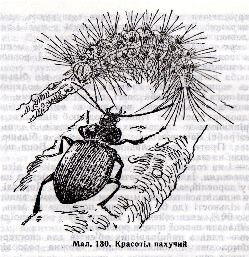 Дуже гарні і корисні жуки-красотіли (мал. 130). Тримаються вони на деревах, де полюють за гусінню соснового шовкопряда та іншими гусеницями, яких не поїдає більшість птахів. Учепившись у гусінь, жуки падають з нею на землю, де і поїдають її. Ці гарні жуки (див. табл. VIII,3) стали досить рідкісними, тому також потребують охорони. Проте є серед турунів невеликі і непоказні чорні жуки з бронзовим відливом — туруни хлібні, які пошкоджують сходи зернових культур і виїдають зерна в колосках. Під час екскурсій до водойм діти можуть побачити цікавих хижих жуків — плавунців (див. табл. VIII, 4) і вертячок. Про них можна розповісти, що живе плавунець у ставках, тихих заводях річок. Верхні крила у нього гарні — темно-коричневі з жовтою смужкою по краях. Тіло жука овальне, сплющене, а задні ноги вкриті волосками-щетинками, і, підгрібаючи ними, неначе веслами, жук швидко пливе. Інколи він піднімається на поверхню води, щоб набрати повітря. Жук-плавунець — хижак. Він нападає на комах, рачків, пуголовків. Цим же живляться і його дітки-личинки, які живуть у воді. Інколи навесні жуки переселяються з однієї водойми в іншу. Тоді їх можна побачити навіть на вулиці міста. Жуки-плавунці прикрашають нашу природу, але коли вони поселяються у ставках, де розводять риб, рибоводи цьому не радіють. Хижий спосіб життя ведуть і жуки-вертячки, які цілими зграйками кружляють на поверхні стоячих водойм. Слід розповісти дітям, що кружляючи по воді, ці жучки вишукують здобич — маленьких тваринок. Личинки вертячок живуть у мулі і також живляться маленькими тваринками. А ось жук-водолюб (див. табл. VIII, 5) — не менш цікавий мешканець водойм — живиться зовсім інакше. І розповісти про нього дітям можна приблизно так: «Водолюба легко відрізнити від плавунця: він більший, опуклі ший, весь чорний. Живе у ставках, живиться водяними рослинами. Задні ноги у водолюба довгі, вкриті волосками, але плавати так швидко, як плавунець, водолюб не вміє. Частіше він повзає по підводних рослинах. Навесні водолюб відкладає яйця в кокон, прикріплюючи до плаваючих у воді листків. З яєць виходять товсті і незграбні личинки, які мало плавають, а більше повзають по рослинах. Проте рослин личинки не їдять. Вони полюють на комах, інколи на мальків риб». Скрізь — і на городі, і у саду, парку чи в лісі — діти зустрічаються з сонечками. їх існує багато видів і більшість з них хижаки не тільки у дорослій, але й у личинковій стадії. Дорослі сонечка і їх личинки живляться головним чином попелицями, знищуючи їх у величезній кількості (до 60 яблуневих попелиць за день, що складає близько 50 % маси сонечка). Тільки деякі рослиноїдні сонечка можуть завдавати певної шкоди рослинам. Сонечко — один з найцікавіших об'єктів для спостережень навіть з наймолодшими дошкільниками. Можна розповісти дітям про цього жука так: «Сонечко — дуже гарний жук. На червоних крилах наче намальовані сім чорних крапок. Своїм забарвленням сонечко попереджає пташок: не беріть мене, я неїстівне. Подивіться, яку крапельку жовтої рідини залишає сонечко, якщо його потримати на руці. Вона гірка і не до вподоби пташкам. Живляться сонечка попелицями, поїдаючи їх у великих кількостях. Цим вони приносять велику користь городам, садам і лісам». Старшим дошкільникам слід показати личинки сонечка і розповісти, що влітку сонечко відкладає яйця, з них виходять личинки.