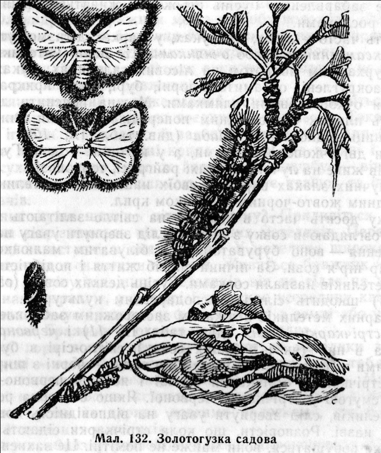 Побачивши золотогузку садову (мал. 132) — невеликого метелика з білими крилами, можна пояснити дітям: свою назву він вдержав за те, що кінець черевця у самиці покритий золотими волосками. Ними самиця вкриває зверху відкладені на листок яйця. Гусінь об'їдає листя плодових дерев. Восени золотогузки сплітають щільне гніздо з листя, де й зимують. Непарний шовкопряд — багатоїдний шкідник, гусінь якого може розвиватися майже на 300 різних рослинах, а особливо на дубі, тополі тощо. Свою назву він одержав через те, що самець і самиця сильно різняться не тільки розмірами (самець значно менший), але і забарвленням: у самців передні крила сірувато-бурі з темними зубчастими лініями, задні крила також бурі. У самиць крила білі з хвилястими смужками. Непарний шовкопряд періодично розмножується у великих кількостях і завдає значної шкоди лісам, садам. Не меншої шкоди завдають монашки, гусінь яких особливо пошкоджує ялинові, рідше соснові ліси. Значний інтерес у дошкільників викликають п'ядуни (див. табл. ХХ, 12), особливо їх гусінь, яку називають землемірами за спосіб пересування. Учепившись ніжками, вона вигинає спину і підтягує задній кінець до переднього так, що її тіло утворює петлю. Увагу дітей можна звернути не тільки на своєрідне пересування, але й на захисне пристосування: форма тіла і забарвлення гусені у спокійному стані роблять їх схожими на сучки рослин. Гусінь п'ядунів в окремі роки може значно пошкоджувати садові і лісові насадження, одночасно слід розповісти дітям про те, що вона використовується птахами як корм. У садах можна показати дітям яблуневу плодожерку — маленького буруватого метелика. Старшим дошкільникам цікаво знати, що плодожерка відкладає яйця на плоди, що зав'язуються. Червиві яблука, вражені її гусінню, падають з дерева. Гусінь залишає їх, заповзає на дерево і вгризається у здорові плоди, що призводить до великої втрати врожаю. Ряд Перетинчастокрилі. Це одні з найбільш високоорганізованих і численних комах. В Україні їх нараховується до 10 тис. видів. Для перетинчастокрилих характерні дві пари перетинчастих прозорих крил з порівняно негустим перетинчастим жилкуванням. Звідси і назва — перетинчастокрилі. Задні крила завжди менші, ніж передні. Ротовий апарат у більшості комах гризучого або гризучо-лижучого типу (хоботок бджіл). На черевці є яйцеклад або яйцеклад видозмінений у знаряддя захисту і нападу — жало. У перетинчастокрилих добре розвинуті нервова система і органи чуття, що зумовлює їх складну поведінку. Перетинчастокрилі комахи мають велике значення в природі і в господарській діяльності людини. Домашні і дикі бджоли, джмелі запилюють безліч рослин. Медоносна бджола дає мед, віск, лікувальні речовини — бджолину отруту; їздці знищують шкідливих комах. Однак серед перетинчастокрилих є і шкідники сільського господарства, наприклад пильщики, горіхотворки. Проводячи спостереження в саду, діти помічають, що деякі сливи починають раніше синіти, а потім падають на землю. Розгляньте з дошкільниками таку сливу і ви побачите отвір і янтарну краплину застиглої смоли — це пошкодження сливового пильщика (див. табл. X, 2). Самиця пильщика відкладає яйця у пуп'янки слив. Личинка живиться всередині недозрілого плода, виїдаючи спочатку кісточки, а потім м'якуш навколо них. Вражені плоди раніше синіють, а з ходу, зробленого л