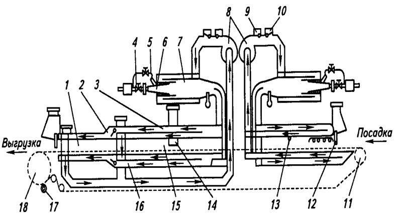 Рис. 1.1. Принципова схема печі 1 -пекарна камера; 2,3,16 -металеві канали; 4 -регулюючий кран; 5 -запальник; 6 -пальники; 7 -топки; 8 -димососи; 9,10,14 -клапани; 11 -натяжний барабан; 12 -підйомні дверцята; 13 -поворотній фартух; 1 5 -патрубок; 17 -металева кругла щітка; 18 -приводний барабан;