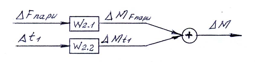 Рис.1.3. Структурна схема по каналу регулювання температури 2. Контур регулювання вологості в пекарній камері. Зі структурної схеми (рис. 1.3.) отримуємо, що на вологість в пекарній камері впливають: температура в печі та витрата пари. Враховуючи функцію передачі по кожному каналу, отримуємо структурну схему у вигляді рисунка1.4.