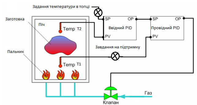 Дана система є класичним прикладом необхідності використання каскадного регулювання. Саме таке регулювання використовується для контурів, які мають велику транспортну затримку по каналу регулювання і в яких є можливість вимірювати проміжну координату, що має меншу інерційність. У такому випадку, оптимальним є формування контуру регулювання температури в першій топці зміною відкриття заслінки пари в топці Т-2 з урахуванням температури газу на вході в другій топці Т-1.Приклад контуру каскадного регулювання наведено на рис.1.17. Потрібно враховувати також необхідність обмеження виходу регулятора, щоб клапан К-1 відкривався поступово, а в ідеалі - за заданою кривою.