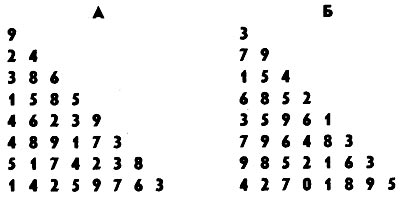 Если ошибка допущена, то экспериментатор повторяет сосед ний ряд цифр, находящийся справа (рис. 14 Б) и состоящий из такого же количества цифр, как и тот, в котором была допущена ошибка, и просит ребенка его воспроизвести. Если ребенок дваж ды ошибается в воспроизведении ряда цифр одной и той же дли ны, то на этом данная часть психодиагностического эксперимента завершается, отмечается длина предыдущего ряда, хотя бы раз полностью и безошибочно воспроизведенного, и переходят к зачитыванию рядов цифр, следующих в противоположном поряд ке — убывающем