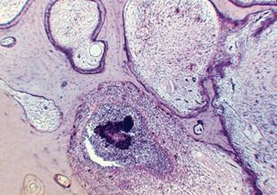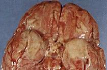 Гной бывает доброкачественный и злокачественный. Доброкачественность и злокачественность гноя определяется соотношением гнойных телец и гнойной сыворотки. Если гнойных телец больше, то гной доброкачественный, он как правило, очень густой. Если гнойных телец меньше, чем сыворотки, то гной злокачественный. Он жидкой консистенции, содержит примеси фибрина и эритроцитов. Для гнойного воспаления характерен лизис тканей. Причиной этого воспаления являются гноеродные микробы — стафилококки, стрептококки, гонококки, менингококки, диплококки Френкеля, брюшнотифозная палочка и др. Гнойное воспаление возникает практически в любой ткани и во всех органах. Течение его может быть острым и хроническим. Основными формами гнойного воспаления являются абсцесс, флегмона, эмпиема, гнойная рана. Абсцесс — отграниченное гнойное воспаление, сопровождающееся образованием полости (округлой или сложной формы), заполненной гнойным экссудатом. Он возникает или в уже погибших тканях, в которых нарастают микробно-химические процессы аутолиза (например, при травме), или в жизнеспособных тканях, подвергающихся сильному воздействию микробов (например, при инфекциях) (рис. 31). По периферии это скопление гноя окружено валом грануляционной ткани, через сосуды которой в полость абсцесса поступают лейкоциты (в основном полиморфноядерные) и частично удаляются из нее продукты распада. Рис. 31 Абсцесс в продолговатом мозге у коровы при листериозе.