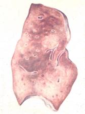 5.3 Продуктивное воспаление. Продуктивное (пролиферативное воспаление). При этом воспалении преобладает фаза С другой стороны биологические повреждающие факторы могут обладать защитными системами, свойствами - например, капсулами, не поддающимся разрушению (микобактерии туберкулеза). Защиту могут обеспечивать и ферменты патогенности, которыми обладают возбудители (гемолитический стрептококк, токсины которого разрушают защитные клетки организма). При слабом иммунном ответе защита организма несовершенна. Слабый иммунный ответ может быть запрограммирован природой в процессе эволюции, в результате генетических ошибок системы кодирования, определяющих иммунный ответ (так называемая система HLA). Если у животного преобладают антитела главного комплекса гистосовместимости HLA, относящиеся к классу Д, то часто на некоторых возбудителей развивается недостаточный, слабый иммунный ответ). 1. Хроническое волнообразное течение. Вокруг этих паразитов, обладающих капсулой, разрастается грануляционная ткань, богатая макрофагами и гигантскими клетками инородных тел. Исход - склероз, рубцевание и с образованием фиброзной капсулы вокруг Отличаются гипертрофические образования от опухолей наличием воспалительной инфильтрации в их строме. Гипертрофические образования удаляют хирургическим путем, важно лечение основного заболевания.