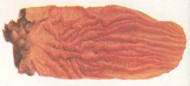 Трактовка экссудата, содержащего примесь крови, как проявления геморрагического воспаления — не всегда простая задача. Так, геморрагическое воспаление характерно для классической и африканской чумы свиней, рожи свиней, пастереллеза, сибирской язвы, натуральной оспы, а также для тяжелых форм гриппа, характеризующихся резким повышением проницаемости стенок сосудов микроциркуляторного русла. Вместе с тем при гнойном воспалении возможны аррозия кровеносного сосуда и кровотечение, но это не означает, что такое воспаление становится геморрагическим. В случае присоединения геморрагического воспаления обычно ухудшается течение болезни, исход которой зависит от вызвавшей ее причины. Катаральное воспаление (рис. 36) (как и геморрагическое) не является самостоятельной формой воспаления. Оно развивается на слизистых оболочках и характеризуется примесью слизи к любому экссудату. Причиной катарального воспаления могут быть различные инфекции, продукты нарушенного обмена, аллергические раздражители, термические и химичёские факторы. При аллергических ринитах, например, слизь примешивается к серозному экссудату. Рис. 36. Катаральный синусит.