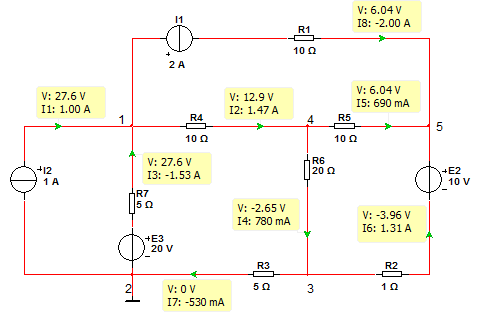 токов ветвей, напряжений на элементах, мощностей источников и приемников.