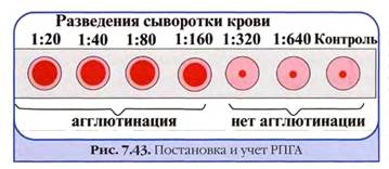 Эритроциты (или частицы латекса) с адсорбированными на них антигенами взаимодействуют с соответствующими антителами сыворотки крови,что вызывает склеивание и выпадение эритроцитов на дно пробирки или ячейки ввиде фестончатого осадка. При отрицательной реакции эритроциты оседают в виде «пуговки». РПГА ставят в пластиковых планшетках или в пробирках с разведениями сыворотки крови больного, к которым добавляют эритроцитарный диагностикум.