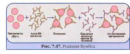 Реакция Кумбса Реакция агглютинации для определения антирезусных антител (непрямая реакция Кумбса). У некоторых больных обнаруживают антирезусные антитела, которые являются неполными, одновалентными. Они специфически взаимодействуют с резус-положительными эритроцитами (Rh+), но не вызывают их агглютинации. Наличие таких неполных антител определяют в непрямой реакции Кумбса. Для этого в систему антирезусные антитела + резус-положительные эритроциты добавляют анти глобул и новую сыворотку (антитела против иммуноглобулинов человека), что вызывает агглютинацию эритроцитов С помощью реакции Кумбса диагностируют патологические состояния, связанные с внутрисосудистым лизисом эритроцитов, например, гемолитическую болезнь новорожденных: эритроциты резус-положительного плода соединяются с циркулирующими в крови неполными антителами к резус-фактору, которые перешли через плаценту от резус-отрицательной матери. Можно также выявлять неполные антитела против антигенных микробов.
