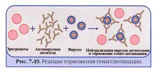 Реакция торможения гемагглютинации Гемагглютинины вирусов склеивают эритроциты. Это свойство используют в реакции гемагглютинации для индикации и титрования вирусов, что необходимо для последующей постановки РТГА. Реакция торможения гемагглютинации основана на блокаде, подавлении антигенов (гемагглютининов) вирусов антитепами иммунной сыворотки, в результате чего вирусы теряют свойство агглютинировать эритроциты. РТГА применяют для диагностики многих вирусных болезней, возбудители которых (вирусы гриппа, кори, краснухи, клещевого энцефалита и др.) могут агглютинировать эритроциты различных животных.