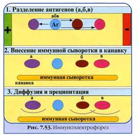 Иммуноэлектрофорез — сочетание метода электрофореза и иммунопреципитации: смесь антигенов вносится в лунки геля и разделяется в геле с помощью электрофореза, затем в канавку геля параллельно зонам электрофорезавносят иммунную сыворотку. Антитела иммунной сыворотки диффундируют в гель и образуют в месте «встречи» с антигеном линии преципитации.