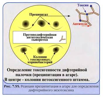 Штаммы возбудителя дифтерии — С, cliphtheriae могут быть токсигенными (продуцирующими экзотоксин) и нетоксигенны- МИ, Образование экзотоксина зависит от наличия в бактерияхпрофага, несущего tox-ген, кодирующий образование экзотоксина. При заболевании все изоляты тестируются на токсигенность — продукцию дифтерийного экзотоксина с помощью реакции преципитации в агаре.