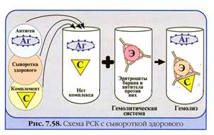 Реакция связывания комплемента Реакция связывания комплемента (РСК) заключается в том, что при соответствии друг другу антигенов и антител они образуют иммунный комплекс, к которому через Fc-фрагмент антител присоединяется комплемент (С), т.е. происходит связывание комплемента комплексом антиген—антитело. Если же комплекс антиген—антитело не образуется, то комплемент остается свободным РСК проводят в две фазы: 1-я фаза — инкубация смеси, содержащей антиген + антитело + комплемент; 2-я фаза (индикаторная) — выявление в смеси свободного комплемента путем добавления к ней гемолитической системы, состоящей из эритроцитов барана, и гемолитической сыворотки, содержащей антитела к ним. В 1-й фазе реакции при образовании комплекса антиген—антитело происходит связывание им комплемента, и тогда во 2-й фазе гемолиз сенсибилизированных антителами эритроцитов не произойдет (реакция положительная). Если антиген и антитело не соответствуют друг другу (в исследуемом образце нет антигена или антитела), комплемент остается свободным и во 2-й фазе присоединится к комплексу эритроцит — антиэритроцитарное антитело, вызывая гемолиз (реакция отрицательная). РСК применяют для диагностики многих инфекционных болезней, в частности сифилиса (реакция Вассермана).