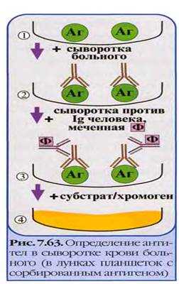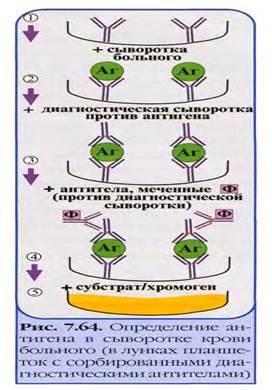 Иммуноферментный анализ — выявление антигенов с помощью соответствующих им антител, конъюгированных с ферментом-меткой (пероксидазой хрена, бета-га- лактозидазой или щелочной фосфатазой). После соединения антигена с меченной ферментом иммунной сывороткой в смесь добавляют субстрат/хромоген. Субстрат расщепляется ферментом и изменяется цвет продукта реакции — интенсивность окраски прямо пропорциональна количеству связавшихся молекул антигена и антител. ИФА применяют для диагностики вирусных, бактериальных и паразитарных болезней, в частности для диагностики ВИЧ-инфекций, гепатита В и др., а также определения гормонов, ферментов, лекарственных препаратов и других биологически активных веществ.Твердофазный ИФА — вариант теста, когда один из компонентов иммунной реакции (антиген или антитело) сорбирован на твердом носителе, напр., в лунках планшеток из полистирола. Компоненты выявляют добавлением меченых антител или антигенов. При положительном результате изменяется цвет хромогена. Каждый раз после добавления очередного компонента из лунок удаляют несвязавшиеся реагенты путем промывания. I. При определении антител в лунки планшеток с сорбированным антигеном последовательно добавляют сыворотку крови больного, анти глобул и новую сыворотку, меченную ферментом, и субстрат/хромоген для фермента. IT. При определении антигена в лунки с сорбированными антителами вносят антиген (напр., сыворотку крови с искомым антигеном), добавляют диагностическую сыворотку против него и вторичные антитела (против диагностической сыворотки), меченные ферментом, а затем субстрат/хромоген для фермента. Конкурентный ИФА для определения антигенов (рис. 7.65). Конкурентный ИФА для определения антител: искомые антитела и меченные ферментом антитела конкурируют друг с другом за антигены, сорбированные на твердой фазе.