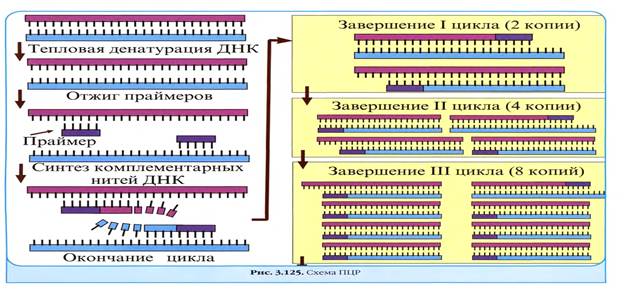 Полимеразная цепная реакция: основана на амплификации, т.е. увеличении количества копий специфического (маркерного) гена возбудителя. Для этого двунитевую ДНК, выделенную из исследуемого материала, денатурируют («расплетают» при нагревании) и достраивают (при охлаждении) к расплетенным нитям ДНК новые комплементарные нити. В результате из одного гена образуются два. Этот процесс копирования генов многократно повторяется при заданных температурных режимах. Достраивание новых комплементарных нитей ДНК происходит при добавлении к искомым генам праймеров (затравки из коротких од- нонитевых ДНК, комплементарных З'-концам ДНК искомого гена), ДНК-полимеразы и нуклеотидов.