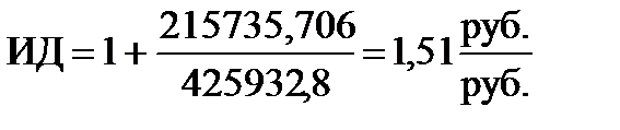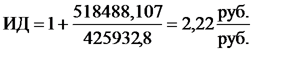 Ток.п.=5,08 лет – от начала расчетного периода. Чистый доход по методике экспресс-оценки определён по формуле: ЧД=(Пч+Иа)∙Тэкспл-К=(85561,38+18741,043)∙28-425932,8=2494535,04 руб. Чистый дисконтированный доход определяется: При Е = 10%: ЧДД=(Пч+Иа)∙Ds-К=(85561,38+18741,043)∙9,307-425932,8=518488,11 При Е= 16%: ЧДД=(Пч+Иа)∙Ds-К=(85561,38+18741,043)∙6,152-425932,8=215735,71руб.