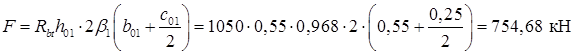 где Fai – расчетная нагрузка на угловую сваю с учетом моментов в двух направлениях, включая влияние местной нагрузки (например, от стенового заполнения), h01 – рабочая высота сечения на проверяемом участке, равная расстоянию от верха свай до верхней горизонтальной грани плиты ростверка или его нижней ступени; b01; b02 – расстояния от внутренних граней угловых свай до наружных граней плиты ростверка; c01; c02 – расстояния от внутренних граней угловых свай до ближайших граней подколенника ростверка или до ближайших граней ступени при ступенчатом ростверке;