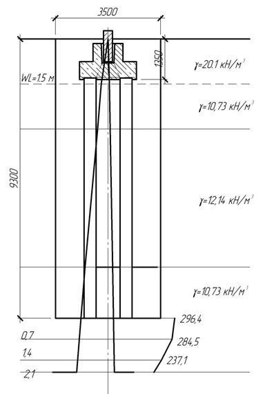 Определим параметры условного фундамента. Подошва условного фундамента располагается на глубине 9,3 м от уровня планировки. Определим ширину условного фундамента из расчета того, что подошва ростверка располагается на отметке 1,35 м ниже уровня планировки. Ширина условного фундамента равна: