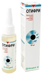 Лосьон для чистки ушей собак и кошек (очищение наружного слухового прохода). Состав: вода, пропиленгликоль, эмульгатор (кремофор EL), календула. Свойства: Отифри – это ухаживающий и очищающий лосьон для ушей, интенсивно растворяющий ушную серу и грязь, тем самым достигается эффективное сокращение количества бактерий и грибов в наружном слуховом проходе. Благодаря содержанию календулы Отифри нормализует структуру кожи, повышает ее резистентность, влажность и эластичность. Применение: заполните слуховой канал очищающим лосьоном, затем легкими массирующими движениями от основания уха к его верхней части равномерно распределите лосьон для растворения ушной серы и загрязнений. Интенсивность массирования зависит от болезненности ушей. Жидкость удалить из слухового канала ватным тампоном. От остатков лосьона и ушной серы животное может освободиться самостоятельно при встряхивании головой. При сильном загрязнении слухового канала обработку лосьоном ОТИФРИ можно повторить. Хранить в сухом, защищенном от света месте, при температуре 15-25°С. Срок годности указан на упаковке. Меры предосторожности: необходимо соблюдать меры предосторожности при использовании ватных палочек для очищения наружного слухового прохода во избежание его повреждения. При заболевании ушей необходима консультация ветеринарного врача.