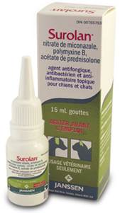 Суролан - комплексное лекарственное средство для лечения отитов у собак и кошек бактериальной, грибковой и паразитарной этиологии. Препарат представляет собой прозрачную сиропообразную суспензию, со слабым специфическим запахом. Миконазол нитрат - синтетическое производное имидазола с ярко выраженной противогрибковой деятельностью и сильным действием против грамположительных бактерий. Полимиксин В сульфат - полипептидный антибиотик с бактерицидным действием против грамотрицательных бактерий. Ацетат преднизолона - глкжокортикоид с сильным противовоспалительным и противозудным действием. Суролан, по степени воздействия на организм, относится к умеренно опасным веществам, в рекомендуемых дозах не оказывает кожно-раздражающего и резорбтивно-токсического действия. Состав: миконазол нитрат, полимиксин В сульфат, ацетат преднизолона. Другие ингредиенты: кремния диоксид коллоидный, жидкий парафин. Показания и способ применения: Суролан используется для лечения у собак и кошек терапевтического отита наружного уха и дерматита, вызванного: Дрожжами и грибками (Microsporum spp., Trichophyton spp., Candida spp., Malassezia pachydermatis); Грамположительными бактериями (Staphylococcus spp., Streptococcus spp.); Грамотрицательными бактериями (Pseudomonas spp., Escherichia coli); Ушными клещами (Otodectes cynotis). Суролан также обладает противовоспалительным и противозудным действием. Используется для лечения воспаления паранальных желёз. Дозировка: уши: 3 - 5 капель препарата в каждое ухо два раза в день. Кожа: на поврежденные области два раза в день. В случае грибкового или бактериального отита лечение должно быть беспрерывным до прошествия нескольких дней после исчезновения клинических симптомов. В некоторых хронических случаях лечение может потребовать от 2 до 3 недель, при потребности в более длительном лечении необходимо связаться с ветеринаром, чтобы оценить состояние животного. При лечении отодектоза, капать по пять капель ежедневно в течение 14 дней. При инвазии ушных клещей необходимо лечить оба уха, даже если инвазия наблюдается только в одном. Побочные эффекты: побочных явлений и осложнений при применении Суролана в соответствии с инструкцией по применению, как правило, не наблюдается. В период беременности и лактации препарат применяется без ограничений. Противопоказания: не использовать для животных с перфорированными барабанными перепонками и при повышенной индивидуальной чувствительности к входящим в состав препарата компонентам.