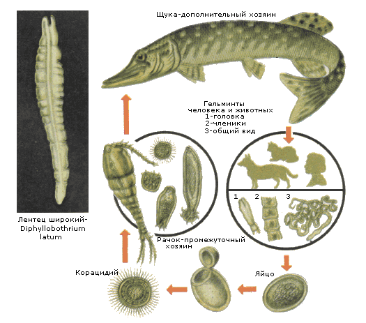 Рис. 3. Жизненный цикл широкого лентеца. Возбудитель – Diphyllobothrium latum.