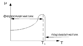 Резкий спад μ после температуры Кюри связан с тепловой разориентацией магнитного момента в доменах.