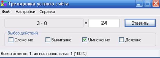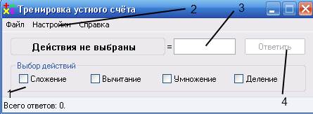 Заключение. Программа "тренировка устного счёта" является функциональной программой, предназначенной для проведения подготовительных, проверочных и контрольных работ по математике. Она отличается приятным графическим оформлением. Программа поможет самостоятельно тренироваться в устном счёте, без чьей либо помощи. Программа будет полезна всем, кто ей будет пользоваться. В ходе выполнения курсового проекта были закреплены понятие объектно-ориентированного программирования, навыки по программированию в объектно-ориентированной среде. Программа, описанная в курсовом проекте, разработана в соответствии с постановкой задачи на курсовое проектирование по теме "Устный счет" по дисциплине "Программирование на языке высокого уровня"