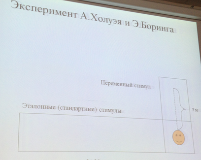 Они постепенно из сцены эксперимента удаляют часть зрительных признаков Они создают установку эксперимент. и испытуемый сидит м/у этими двумя коридорами, ему показываются стимулы, желтые диски, разных размеров от малого к большему, в другом коредоре предьявляют стимул в виде диска, но размер которого испытуемый сам может изменять с помощью спец ручки и каждый раз предьявляя ему диски из другой трубы просили изменить размер изменяемого диска до предьявляемого.