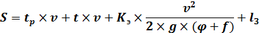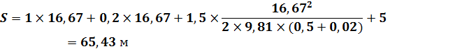 где tp – время реакции водителя (tp=1 с); v – расчетная скорость движения по съезду; t – время срабатывания тормозов и нарастания тормозного усилия в колесах автомобиля (t=0,2 с); Kэ – коэффициент эксплуатационных условий торможения (Kэ=1,5); g – ускорение свободного падения (g=9,81 м/с2); φ – коэффициент продольного сцепления колес автомобиля с покрытием (φ=0,5); f – коэффициент качения (f=0,02); l3 – расстояние безопасности (l3=5 м). Для I технической категории: для левоповоротных съездов: