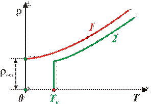 Рис.4.4. Зависимость удельного сопротивления от температуры Остаточное сопротивление Зависимость электрического сопротивления от температуры положено в основу термометра сопротивления. Такой термометр представляет собой металлическую (обычно платиновую) проволочку, намотанную на фарфоровый или алюминиевый каркас. Проградуированный по постоянным температурным точкам термометр сопротивления позволяет измерить с погрешностью порядка нескольких сотых кельвин как низкие, так и высокие температуры. В последнее время все большее применение находят термометры сопротивления из полупроводников. О заряде внутри проводника с током. Если ток постоянный, то избыточный заряд внутри однородного проводника всюду равен нулю (см. теорему Гаусса). Избыточный заряд может появиться только на поверхности однородного проводника, в местах соприкосновения с другими проводниками, а также там, где проводник имеет неоднородности. Если токи стационарны, то распределение электрических зарядов в проводящей среде (вообще говоря, неоднородной) не меняется во времени, хотя и происходит движение зарядов: в каждой точке на место уходящих зарядов непрерывно поступают новые. Эти движущиеся заряды создают такое же кулоновское поле, что и неподвижные заряды той же конфигурации. Стало быть, электрическое поле стационарных токов — поле потенциальное. Вместе с тем электрическое поле в случае стационарных токов существенно отличается от электростатического — кулоновского поля неподвижных зарядов. Последнее внутри проводников при равновесии зарядов равно нулю. Электрическое поле у стационарных токов есть также кулоновское поле, однако заряды, его возбуждающие, находятся в движении. Поэтому поле