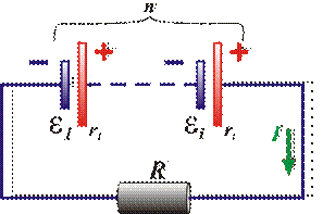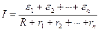 Рис.4.10 Батарея из n последовательно соединенных источников, питающих нагрузку R. При параллельном соединении n одинаковых источников (рис.4.11), сила тока определяется так: