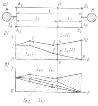 При односторонней схеме питания двухпутного участка и отсутствии поперечных соединений контактных подвесок путей нагрузка фидера любого пути определяется так, как это делается при одностороннем питании однопутного участка. Если питание двухпутного участка осуществляется от одного фидера, а соединение контактных подвесок выполнено в конце фидерной зоны, то расчет нагрузки фидера ведут как для однопутного участка. Если соединение фидеров путей осуществляется в пункте П (рис. 6.6, г) на расстоянии При схеме двустороннего питания двухпутного участка и отсутствии поперечных связен контактных подвесок путей расчет нагрузок фидеров ведут так же, как и для схемы двустороннего питания однопутного участка. В случае наличия поста секционирования (рис. 6.6, а) в питании каждого поезда участвуют все четыре фидера. Допустим, имеется тяговый расчет для поезда нечетного направления данного типа Поезд данного типа, перемещаясь по зоне, может находиться либо на участке А1П, либо на ПВ1. Когда поезд находится на участке А1П, то ток Подготовив таким образом кривые тяговых расчетов поездов всех типов четного и нечетного направлений и перестроив их в функции