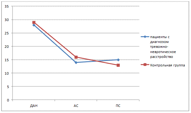 Рисунок 10. Сравнение средних показателей по методике МЛО «Адаптивность» 2 уровня. Как видно на рисунке 10, у пациентов с диагнозом тревожно-невротическое расстройство и у контрольной группы не наблюдается превышение значений по шкалам «Астенических реакций и состояний» (АС), «Психотические реакции и состояния» (ПС) и интегральной шкале ДАН. Так же можно сказать, что обе выборки не имеют значимых различий.