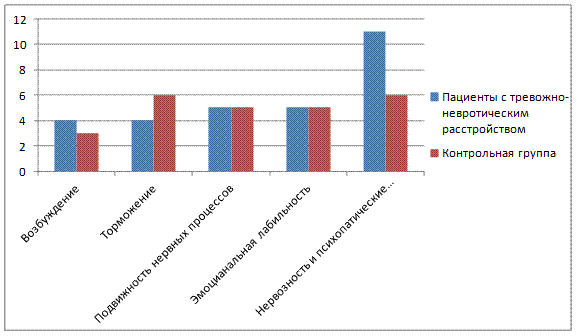 Примечание: p<0, 05*- обнаружены статистически достоверные (значимые) различия p<0,01**- различия обнаружены на высоком уровне статистической значимости. Как говорилось ранее, у пациентов с диагнозом тревожно-невротическое расстройство присутствует наличие повышенной нервозности и психопатических черт. Так же, можно сказать, что у пациентов с диагнозом тревожно-невротическое расстройство показатели по шкале возбуждение выше, чем у контрольной группы, а показатели по шкале торможение ниже. Date: 2015-07-24; view: 562; Нарушение авторских прав |