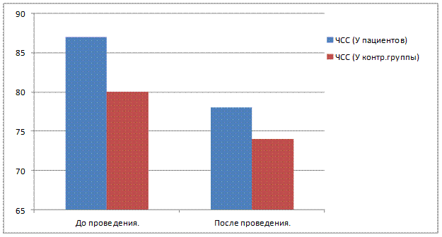 Как показано на рисунке 13, между пациентами с тревожно-невротическим расстройством и контрольной группой значимых различий показателей АД и ЧСС до проведения исследования нет. Но после проведения исследования показатели ЧСС у пациентов с тревожно-невротическим расстройством снизились как и у контрольной группы.