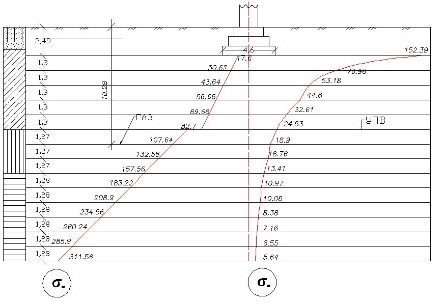 Р0 - дополнительные напряжения на основание (в сочетании №3 по табл.2); А=39.14 м2 - площадь подошвы; По вычисленным значениям Рис.5.3. Схема распределения вертикальных напряжений