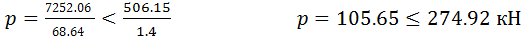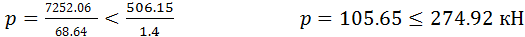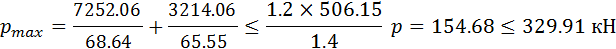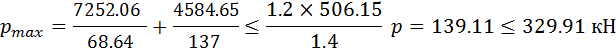 где р и рmax – среднее и максимальное давление под подошвой; А=а*b – площадь подошвы A=11,98*5,73=68.64 м2; W=а*b2/6 (вдоль моста) W=65.55 м³; W=а2*b/6 (поперек моста) W= 137 м³, - момент сопротивления подошвы;