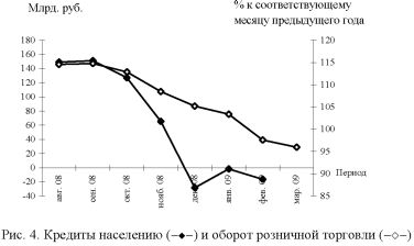 Тем не менее, несмотря на значительно меньшее обесценение рубля по сравнению с 1998 г., девальвация национальной валюты приведет к определенному удорожанию импортной продукции, что скажется на росте потребительских цен. Это означает, что для определения перспектив развития динамики потребительского спроса необходимо, кроме возможных объемов кредитования населения, принимать во внимание возможный уровень инфляции. Рассматривая вопрос о возможном уровне потребительских цен, следует отметить важную особенность механизма протекания инфляции в России. На наш взгляд, она состоит в том, что причины инфляции сформированы вне пределов национальной экономики. Такая ситуация вызвана тем, что в условиях открытости национальной экономики верхняя граница возможного уровня цен на потребительском рынке задается импортными ценами в рублевом эквиваленте, т. е. зависит, с одной стороны, от уровня мировых цен, а с другой - от колебаний курса национальной валюты. Очевидно, что емкость российского рынка потребительских товаров мала и не может влиять на формирование уровня мировых цен. В свою очередь курс национальной валюты также в значительной степени зависит от факторов, возникающих вне пределов национальной экономики (к ним, прежде всего, относятся мировые цены на основные товары российского экспорта). Вместе с тем инфляция издержек заставляет отечественных производителей все время повышать цены до пределов возможной верхней ценовой границы. Это означает, что до тех пор, пока внутренние цены на сырье не сравняются с уровнем мировых цен, потребительские цены все время будут стремиться к максимально возможному уровню мировых цен, компенсируя инфляцию издержек. В настоящее время делать окончательные выводы о влиянии девальвации рубля на рост потребительских цен преждевременно. Фактически девальвация рубля начала оказывать заметное воздействие на уровень внутренних цен только в феврале 2009 г., что проявляется в ускоренном росте цен на непродовольственные товары. Так, рост потребительских цен на непродовольственные товары составил 1,6% и был самым высоким начиная с ноября 2000 г. В свою очередь потребительские цены по отдельным группам непродовольственных товаров в феврале 2009 г. повысились более чем на 2%. Тем не менее существуют два различия между кризисной ситуацией в 1998-1999 гг. и в начале 2009 г. Во-первых, в период первого кризиса российский рубль обесценился практически в 4 раза по отношению к доллару США, тогда как в 2009 г. (в случае, если ЦБ сумеет удержать курс рубля в рамках заявленного коридора) рубль обесценится к бивалютной корзине всего в 1,3 раза. Во-вторых, если в первый период перед девальвацией запасы розничной торговли формировались на 60% из импортных товаров и на 40% из товаров внутреннего производства, то к концу 2008 г. соответственно на 44 и 55%. С учетом данных факторов максимально возможная верхняя граница роста потребительских цен может быть приближена к 25%. Это значительно ниже, чем в 1998-1999 гг., и не приведет к резкому снижению покупательной способности доходов населения, как во время первого кризиса. Что касается перспектив потребительского кредитования, то они во многом связаны с двумя факторами: стабилизацией денежного предложения и прекращением роста безработицы. Как отмечалось выше, статистические данные о развитии рос