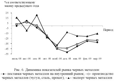 Отчасти снижение производства черных металлов было обусловлено сужением внешнего спроса, однако основной причиной уменьшения объемов производства стало сокращение поставок на внутренний рынок в декабре 2008 г. на 52% по отношению к декабрю 2007 г, тогда как пик падения экспорта был пройден в ноябре 2008 г. (-38%), и в декабре 2008 г. - феврале 2009 г. дальнейшего сужения экспортных поставок не наблюдалось. Вместе с тем сокращение поставок черных металлов на внутренний рынок значительно превысило падение объемов производства в отраслях основных потребителях данной продукции (рис. 6). Как показано на рис. 6, в ноябре и декабре прошлого года поставки черных металлов на внутренний рынок упали на 45 и 52%, тогда как в те же месяцы темпы роста в строительстве составляли 6,3 и 0,1%, в производстве машин и оборудования -17,3 и -45,9%, в производстве транспортных средств и оборудования - -21,2 и -36% соответственно. Более быстрое сокращение поставок черных металлов на внутренний рынок по сравнению с сокращением выпуска в основных отраслях - потребителях черных металлов, свидетельствует с одной стороны, о том, что в условиях недостатка денежных средств потребители промежуточной продукции старались в первую очередь израсходовать имеющиеся складские запасы, а с другой - о сохранившемся внутреннем спросе на промежуточную продукцию, который превышал объем внутреннего производства и на фоне исчерпания складских запасов стримулировал восстановительный рост выпуска черных металлов в начале 2009 г.