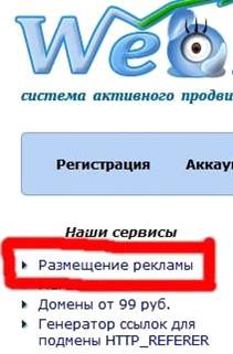 Баннерная реклама - за один день рекламы платите от 0.30$ до 1$ Оплачиваемые ссылки - за 1000 кликов платите всего 1$ («Размещение рекламы», далее «оплачиваемые ссылки») Начни пока с оплачиваемых ссылок! Оплачиваемые ссылки размещать проще, поэтому сейчас я покажу, как разместить рекламу на примере баннерной на сайте http://webisida.com Итак, для начала переходим на сайт Webisida.com В левом углу есть кнопка Размещение рекламы