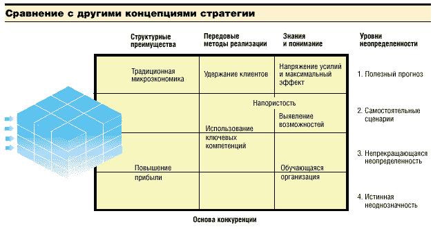 Превращение стратегических позиций и источников получения преимуществ перед конкурентами в конкретные стратегические решения связано не только с выбором подходящей для вас позиции.Наверное, любая сложная концепция бизнеса конструируется из строительных блоков четырех типов: крупные ставки;реальные и финансовые опционы; действия, впоследствии не вызывающие сожалений, и системы обеспечения безопасности. Крупные ставки — это инвестиции, которые в одних ситуациях могут принести большую прибыль, но в других — обернуться плачевными результатами.Финансовые и реальные опционы обеспечивают компании гибкость как с финансовой, так и с операционной точек зрения.Что такое финансовые опционы, понять не сложно.Реальные же опционы — это инвестиции в материальные активы и эксплуатационные затраты, сделанные для того, чтобы приобрести знания или придать компании гибкость (например, установка оборудования, которое может работать с различными видами сырья).Действия, не вызывающие впоследствии сожалений, всегда имеют смысл, независимо от дальнейшего хода событий. Наконец, системы обеспечения безопасности — это специально разработанные варианты защиты компаний на случай нежелательных последствий крупных ставок. Рассмотрим случай крупной специализированной химической компании, перед которой стоит трудная проблема:какую из двух новых технологий возьмет на вооружение отрасль, к которой она принадлежит?Предположим, что компания решила сделать крупные инвестиции в одну из этих технологий.Если бы впоследствии другие компании признали правильность этого выбора, компания смогла бы сформировать новую технологическую базу отрасли.В этом и заключается смысл крупной ставки:если бы компании не удалось убедить других в превосходстве выбранной ею технологии, ее заводы оказались бы в трудном положении.Компания могла бы дополнить крупную ставку действиями, которые впоследствии не вызовут сожалений, такими как осуществление программ по сокращению затрат и расширению объема продаж, а также системами обеспечения безопасности, например, запланировав усовершенствование второй технологии на случай, если ставка на первую окажется ошибочной. Схема 4 Сравнение с другими концепциями стратегии