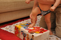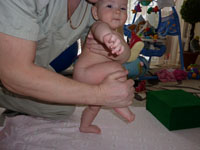 Упражнение «ступенька» Поучите малыша подниматься на ступеньку. Для этого нм понадобится прочная коробка высотой 6-7 см. Исходное положение как и в предыдущих упражнениях. Перед его ногами поставьте ступеньку. Свободной рукой возьмите ножку малыша в области голеностопного сустава, приподнимите ее, сгибая в коленном суставе. Поставьте на ступеньку, плотно прижимая подошву стопы к поверхности ступеньки. Помогите малышу перенести вес тела на эту ногу и выпрямить ее, поднимаясь на ступеньку. Затем вторая ножка должна встать рядом с первой. Вернитесь в исходное положение и повторите упражнение еще 3-5 раз, начиная движение с каждой ноги по очереди. Если у ребенка хорошо получается вставать на одну ступеньку, сделайте ему для занятий лесенку из 2-3 ступенек. Для этого также можно использовать аналогичные прочные коробки (например, из под обуви), которые наверняка можете найти у себя дома. Сначала вы помогаете малышу подняться по лесенке путем поочередной перестановки его ног и переноса веса его тела на опорную ногу. Повторите упражнение 3-5 раз. Когда малыш запомнит необходимые движения предоставьте ему возможность переставлять ноги самостоятельно.