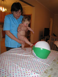 О будущей правильной походке малыша надо позаботиться заранее, не дожидаясь первых самостоятельных шагов. Походка начинается с правильной своевременной опоры на ноги и правильного положения стопы.Сначала тренируем правильную опору ног при соприкосновении стоп ребенка с поверхностью пола или стола. Чуть позже нам потребуется для этого гимнастический мяч.Но сначала пошагаем с ребенком, лежащим на спине. Для этого возьмите его ноги в области голеностопных суставов, согните их в коленях и поставьте на стол, плотно прижимая подошвыстоп к поверхности стола. Теперь пошагайте по столу сначала на одном месте, затем переставляя ножки на несколько шагов вперед, потом вернитесь назад. Повторите упражнение 3-5 раз. Следите, чтобы при этом пальчики на ногах не поджимались, а стопы не косолапили. Положите ребенка на мяче на живот, удерживайте его при этом в подмышечной области. Прокатите малыша на мяче на себя до соприкосновения его подошв с поверхностью стола либо с массажным ковриком. Вы должны добиться в этот момент выпрямления ног и удержания веса тела при опоре на ноги. Повторите упражнение 5 – 7 раз. Упражнение «цапля». Выполняется при уверенной опоре на ноги. Тренировка стояния на одной ноге при поддержке ребенка в подмышечной области. Для этого возьмите малыша спиной к себе, поставьте его на стол или пол. Одной рукой обнимите его за талию, другой рукой возьмите голень ребенка и согните ногу в коленном суставе. Удерживайте ее в таком положении до 5-7 секунд. При этом ребенок должен удержать свой вес на одной опорной ноге, не сгибая ее. Повторите упражнение 2 – 3 раза для каждой ноги.