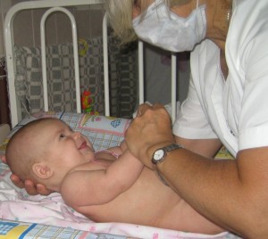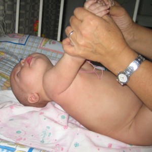1. Малыш лежит на животе, руки согнуты в локтевых суставах и отведены, ладонями вниз, голова поднята. Свои пальцы вложите в ладони ребенка и захватите его кисти. Медленно потяните малыша за руки вперед с разгибанием в локтевых суставах до тупого угла. Далее следует пауза, подождите пока ребенок согнет руки в локтевых суставах до исходного положения. При выраженной слабости можно помочь, подставив ладони под пятки ребенка. Повторите 5 — 7 раз. Желаемый результат — добиться смещения туловища только при помощи рук за счет подтягивания на расстояние до 50 см и более. 2. Теперь положите малыша на спину с приподнятой верхней половиной туловища на угол в 45 градусов, для этого под плечи и голову подложите жесткую подушку. Вложите свои пальцы в ладони ребенка и захватите его кисти. Теперь медленно потяните малыша за руки без отрыва головы от поверхности подушки. Этим приемом вам нужно добиться активного напряжения сгибателей рук с их дальнейшим сгибанием в локтевых суставах. Повторите 5 — 7 раз. 3. После появления активного сгибания рук в предыдущем упражнении, помогите ребенку одновременно поднять голову над поверхностью, подложив ладонь под затылок. Задержитесь в этом положении на 3 — 5 секунд, постепенно увеличивая продолжительность. Повторите 5 — 7 раз. 4. Если вы достигли умения малыша кратковременно удерживать голову, приподнятую с вашей помощью, продолжайте укрепление передних шейных мышц. Для этого в том же положении ребенка своими ладонями обхватите плечи малыша со стороны спины и слегка приподнимите их над поверхностью, добиваясь активного подъема головы вслед за плечами. Повторите 3 — 5 раз. 5. К более сложному варианту упражнения переходите после достижения ребенком начальной группировки, т.е. приподнимания головы и сгибания рук при потягивании. Для этого упражнение повторите без подкладывания подушки под голову и плечи.