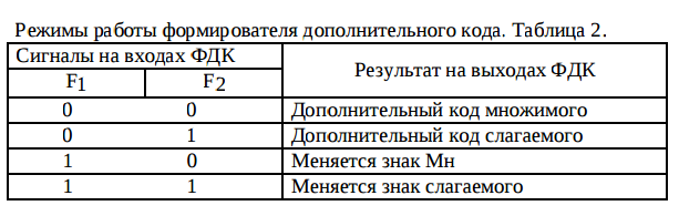 В ОЧС первое слагаемое складывается с нулем, записанным в регистре результата, и переписывается без изменений в регистр результата. На втором такте второе слагаемое из регистра множимого через цепочку ОЧУС попадает на входы ОЧС и складывается с первым слагаемым, хранящимся в регистре результата. Сумма хранится в регистре результата. Разрядность регистра результата должна быть на единицу больше, чем разрядность исходных слагаемых, чтобы предусмотреть возможность возникновения при суммировании переноса. Если устройство работает как умножитель, то множимое и множитель помещаются в соответствующие регистры, а на управляющий вход ФДК F2 поступает «0». Диада множителя поступает на входы преобразователя множителя. Единица переноса в следующую диаду, если она возникает, должна быть добавлена к следующей диаде множителя (выход 1 ПМ). В регистре множителя после каждого такта умножения содержимое сдвигается на 2 двоичных разряда, и в конце умножения регистр обнуляется. Это позволяет использовать регистр множителя для хранения младших разрядов произведения при умножении по алгоритму «Г». Выход 2 ПМ переходит в единичное состояние, если текущая диада содержит отрицание (